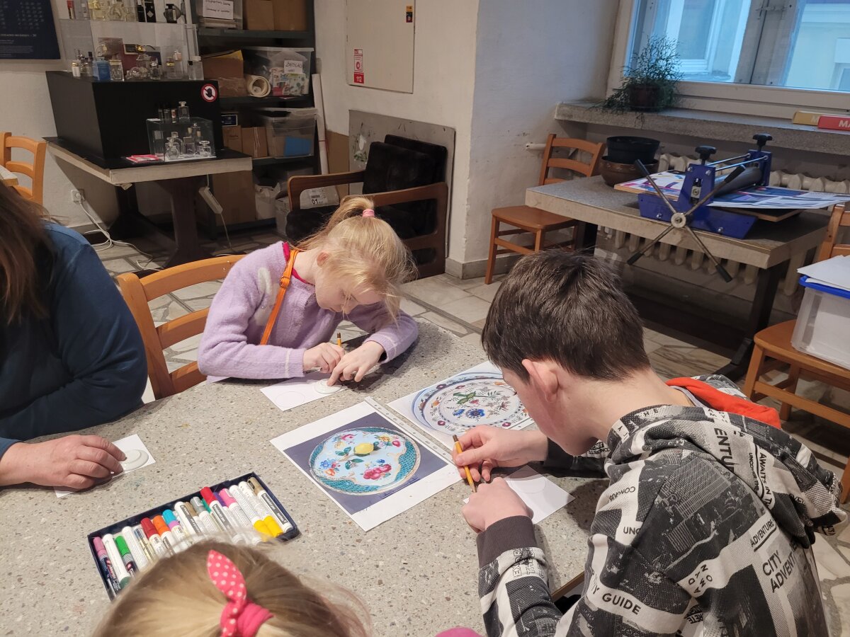 Edukacinio užsiėmimo metu mokiniai susipažino su spalvingais porceliano kūriniais ir pagal jų pavyzdžius dekoravo „baltojo aukso“ lėkštutes.